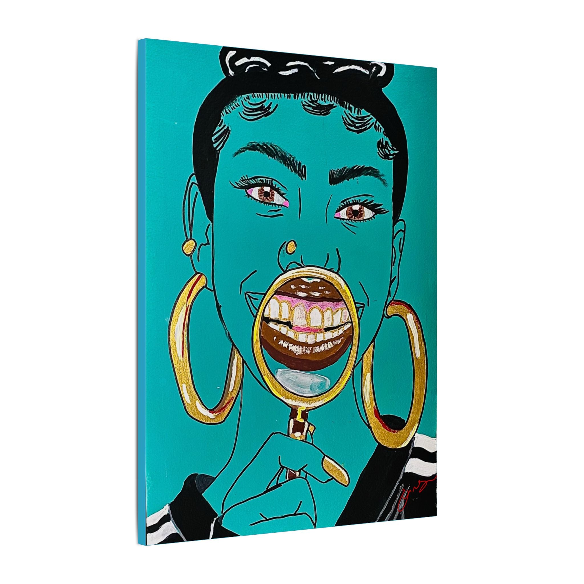 These twin pieces explore how we see and how we are seen—especially through gendered and racialized lenses. In Part 1, the woman stands in turquoise, a color of clarity and intuition, with the magnifying glass disrupting her mouth—asking what happens when our voices are examined, reduced, or misunderstood. In Part 2, the man in orange represents heat, creativity, survival—but he too is scrutinized. The series challenges the idea of visibility itself. What parts of us are magnified, and what parts are intentionally left un colored.